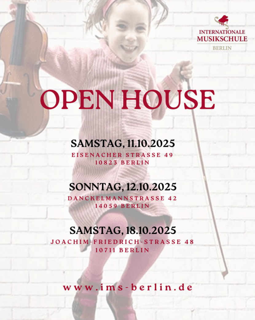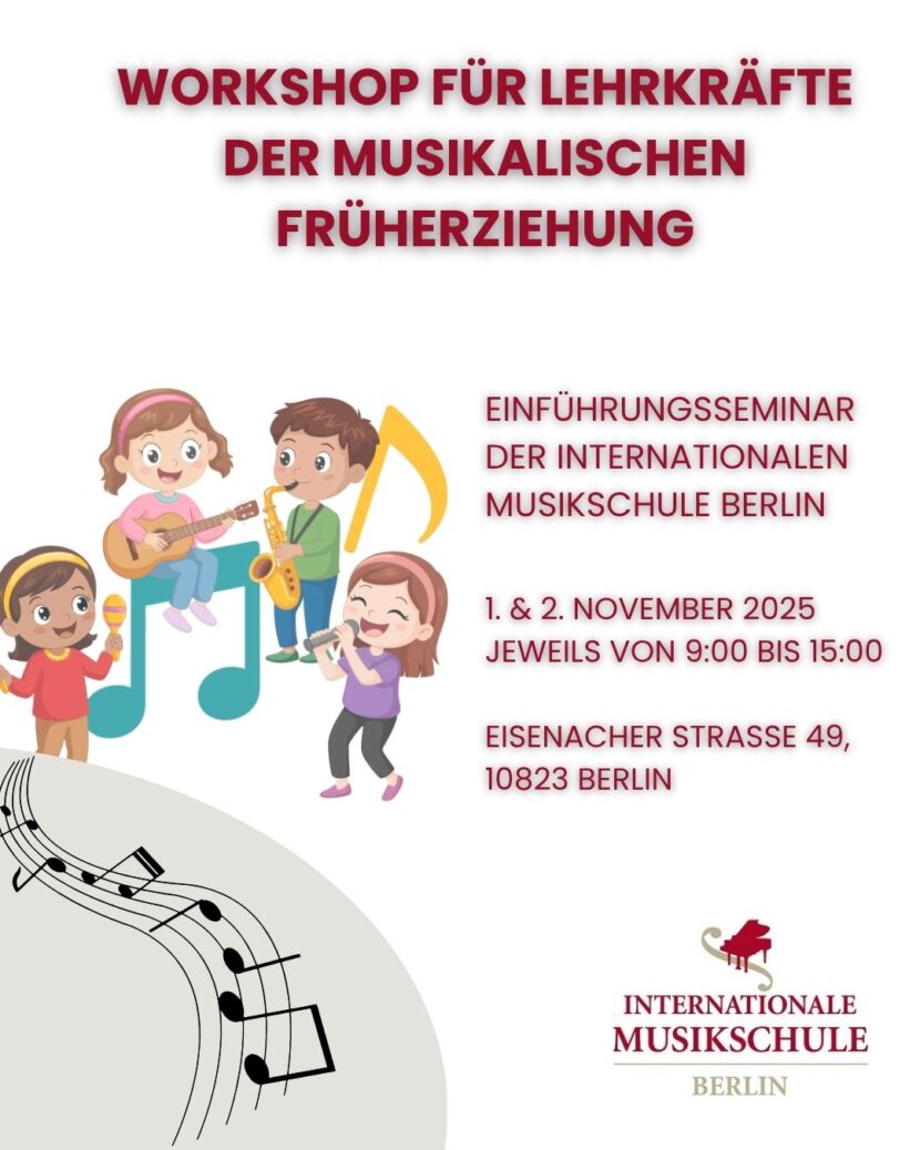 Die Internationale Musikschule Berlin lädt ein zum Einführungsseminar im Bereich Musikalische Früherziehung. Zielgruppe Der Workshop richtet sich an angehende oder interessierte Lehrkräfte, die in der Musikalischen Früherziehung tätig werden möchten. Termine 📅 Samstag, 1. November & Sonntag, 2. November 2025🕘 jeweils von 9:00 bis 15:00 Uhr Ort Internationale Musikschule BerlinEisenacher Straße 49, 10823 Berlin Inhalte […]